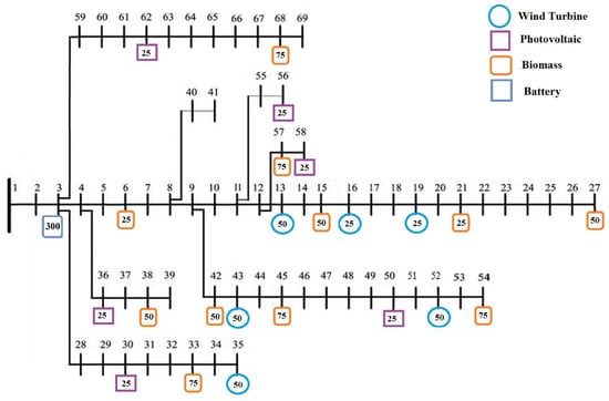 The standard PG & E 69-bus radial distribution network used in [] is selected and reported in Figure 2. The information regarding DG has been taken from [,], where the authors optimized DG position and nominal power in order to stabilize the network by using a heuristic, Tabu Search-based algorithm. The load data has been obtained by using the methodology described in [], where the consumption profiles of medium voltage nodes are aggregated randomly, starting from a set of consumption time series of single households obtained from []. Following this procedure, the load profile of each node of the network has been estimated, with hourly sampling and for a period of a month. The time profiles of the DG production considered in this study have been collected from the website of IESO, the power system operator based in Ontario (Canada) []. The tested Li-ion BESS has a capacity of 300 kWh and a rated power of 300 kW. All the datasets used in this paper cover the period from April to May 2016.