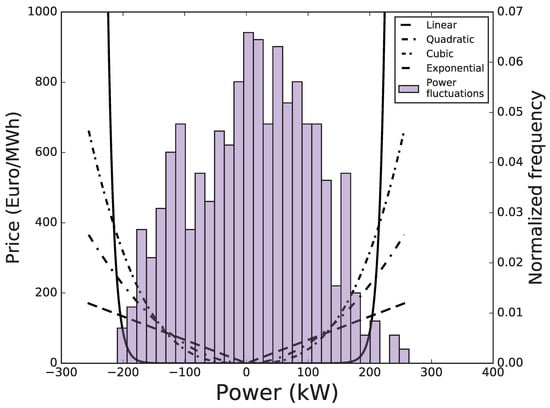 Figure 3 reports the shape of the tested cost functions. Moreover, the proposed cost functions are compared with the histogram of the power fluctuations observed in the PCC with respect to the power profile . Fluctuations are distributed around the interval kW, with some extreme values between 200 and 300 kW.