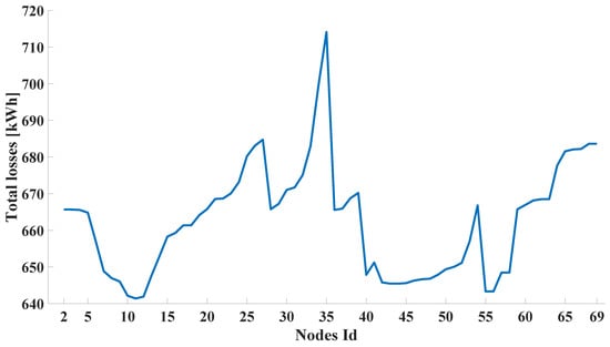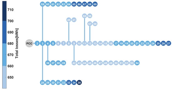The proposed methodology has been applied for the planning procedure involving the correct positioning of the considered BESS. In order to do so, the effects of the tested BESS have been evaluated by simulating the presence of the optimized BESS in one bus of the system. The procedure has been replicated per each node of the network, in order to compare the impact of the BESS position on the operating parameters. As first result, it has been found that all the system constraints given in Section 2 are met for every considered time interval and for every position of the BESS. This high stability of the network is due to two factors: the presence of household users only, and the study of the optimal positioning of DG performed in []. For this reason, no considerations regarding the system voltage phasors and thermal limits should be taken for defining the correct positioning of the BESS. However, the proposed methodology would be able to include these parameters in the planning procedure in case of potentially unstable grids. Moreover, the GA-MPOPF allowed for the estimation of the system losses with respect to the different positioning of the BESS. The results of this procedure are given in Figure 4 and Figure 5. The values associated to each node n represent the monthly losses of the system when the BESS is positioned on the node itself. Values are given in kWh. The best placement of the BESS has been found to be at node 11.