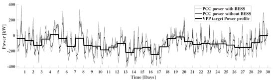 The power profile at the PCC of the considered virtual power plant (VPP), in both presence and absence of a BESS.