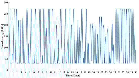 Finally, looking at the behavior of the system in the presence of relevant power peaks, it is possible to notice how the battery energy is almost totally used for reducing the high fluctuation events. This is due to the quadratic shape of the fine cost function, which forces the algorithm to give priority to high fluctuations. In particular, the power requested at PCC level in presence of the highest peaks is reduced by a value between 30% and 50%. The effect of this reduction clearly impacts on the daily system costs. This is evident when comparing Figure 6 and Figure 8 on the days in which the highest fluctuations are present around the mean value. In particular, these are days 2, 5, 8, 10, 15, 22 and 26. Especially on days 2, 8 and 26, it it clearly visible how the fine cost is reduced by approximately 60% by using the BESS. By comparing this values carefully, such a large reduction in fines costs is proper of the days in which it is possible to observe consistent fluctuations in power. These periods do not last for more than two-three hours. If these last longer, as in the case of day 8, the reduction in the fine costs due to the presence of the BESS is reduced to a value of around 30%.
