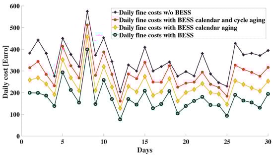 The daily cost of the system. The fine cost and the BESS calendar and cycling aging amortization costs are given as a sum. Also, the daily fine cost of the system without the BESS is given as a reference.
