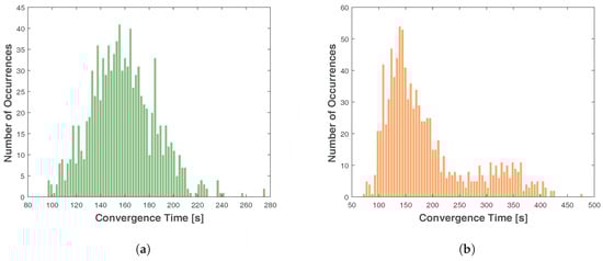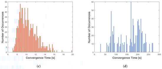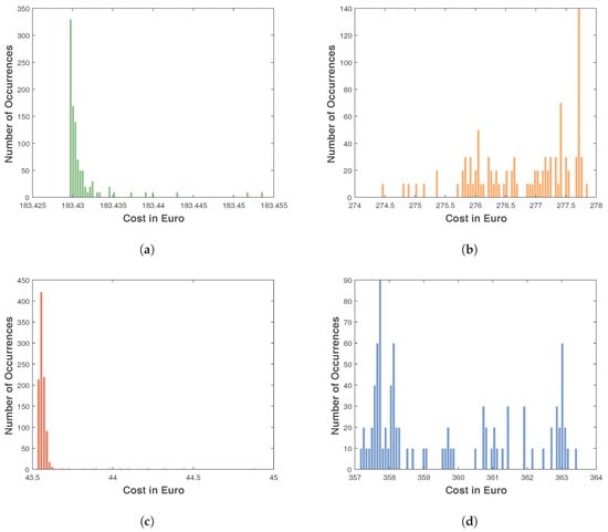 Histograms of the convergence of the total cost considering the four different tested cost functions. (a) Cubic cost function; (b) Quadratic cost function; (c) Exponential cost function; (d) Linear cost function.