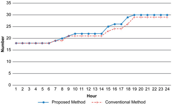 The lower EBH resulting from the proposed method generates significant cost savings. To avoid excessive maintenance costs, the system operator adjusts the power output of some generators to be below the base load limit. Table 4 presents the hourly dispatch volume of the No. 29 generator, for which the base load limit was set at 285 MW. With the conventional method, the No. 29 generator’s output exceeded the base load limit in Hours 20 and 21, whereas with the proposed method, this generator’s output did not exceed the limit. Hence, the maintenance costs associated with this generator can be reduced.