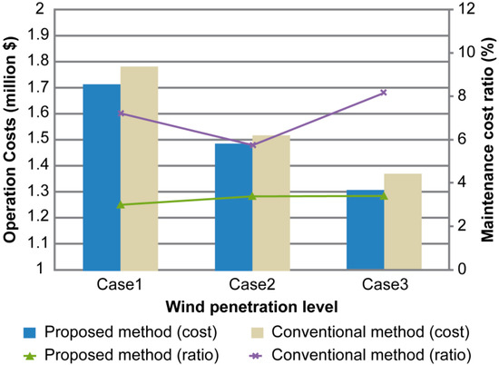In Figure 2, the performance of the proposed method is illustrated with different wind penetration levels in the power system. The maintenance cost ratio means the ratio of maintenance costs to operating costs. Case 2 is the reference case that we performed previously, whereas Case 1 and Case 3, compared with Case 2, represent 50% less and more wind power generators installed, respectively. In all cases, it is clear that the system operator can expect reduced operating costs if it considers maintenance cost in the UC calculation. Moreover, the portion of the total operating cost occupied by the maintenance cost remains low with the proposed method, even when the installed wind power capacity varies. With the conventional method, it can be seen that the maintenance cost ratio exceeded 8% of the total operating cost under certain conditions, resulting in a greater expense to the system operator.