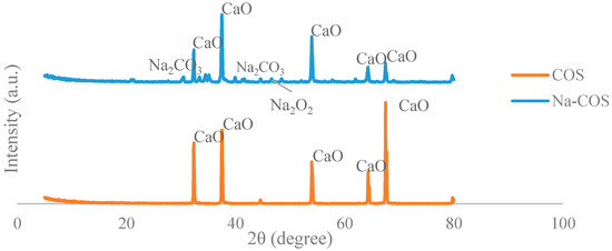 The X-ray diffraction (XRD) analyses were conducted to investigate the bulk structure and crystallinity of the catalyst. The XRD pattern of the COS (Figure 1) presented five major peaks (2θ = 32.35°, 37.5°, 53.95°, 64.3°, 67.5°), all of which were the characteristic peaks of CaO, indicating that the major component of COS is CaO. No characteristic peak of CaCO3 was presented, suggesting that CaCO3 in the oyster shell had been converted into CaO. The XRD pattern of the Na-COS (Figure 1) showed a few additional peaks than those observed with COS. After impregnation of NaOH and subsequent calcination, the resulting catalyst acquired two new phases, Na2O2 and Na2CO3, indicated by the newly generated peaks at 2θ = 46.6° and 2θ = 30.45°, 34.5°, 35.1°, 39.9°, 41.3°, 41.6°, respectively.