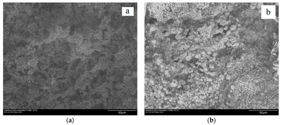 The scanning electron micrographs of morphologies of Na-COS and COS are shown in Figure 5. The surface of COS was nearly homogeneous and covered somewhat uniformly-sized CaO aggregates. However, on the surface of Na-COS, larger particles were generated due to the reaction between adsorbed NaOH and CaCO3. In addition, the morphology of Na-COS was more irregular than COS, probably because of the adsorbed NaOH prevented the complete calcination of the surface CaCO3 and led to the co-existence of both oxides and carbonates.