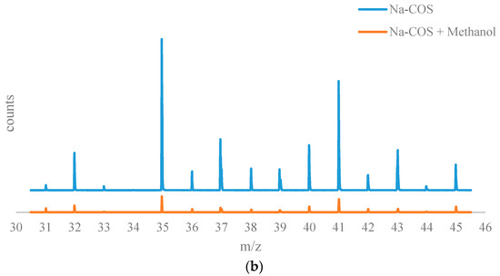 The results from the time of flight secondary ion mass spectrometry (TOF-SIMS) analysis: (a) TOF-SIMS spectra of the positive ions of Na-COS (bottom) and oil-soaked Na-COS (top); (b) TOF-SIMS patterns of the negative ions of Na-COS (top) and methanol-soaked Na-COS (bottom).