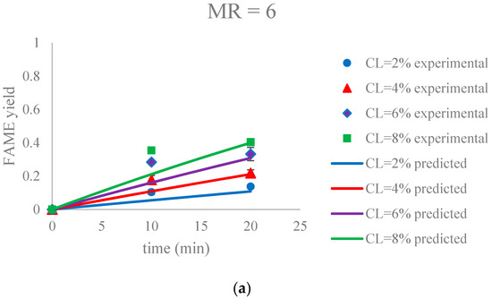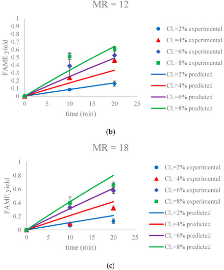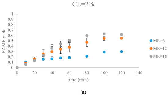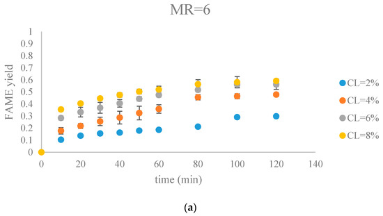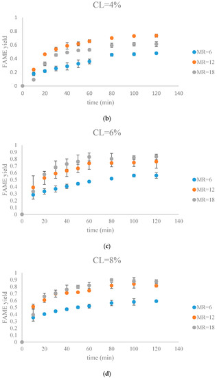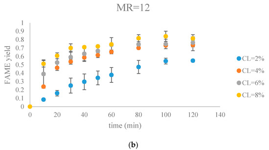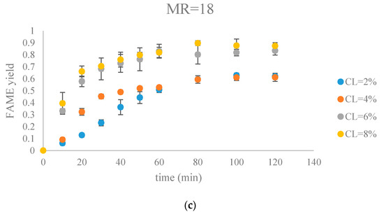Figure 7 and Figure 8 show FAME yields obtained from transesterification reactions performed using different MRs and CLs. It appeared that the transesterification reaction started and progressed immediately from the beginning.