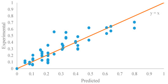 The parameter estimation was performed using the statistical software JMP Pro 12.2.0. The estimated reaction rate constant, k1 = 0.0059 ± 0.0002 L mol−1 min−1, was in the similar range as reported by Aransiola et al. [38]. Figure 9 suggested that this model was a reasonable fit (correlation of coefficient = 0.865) to the data of the initial reaction period (0–20 min). In addition, the experimental and predicted data are shown in Figure 10.