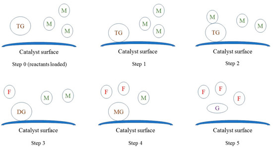 In the light of observations collected from catalyst characterization experiments, it appeared that oil molecules adsorbed on the surface of the catalyst and reacted with methanol in the bulk fluid, similar to the Eley-Rideal mechanism. As shown in Figure 11, the reaction seems to have occurred in steps. In the first step, triglyceride molecules adsorbed on the surface. Subsequently, in the second step, methanol reacted with adsorbed triglyceride molecule to form adsorbed diglyceride and FAME (RDS). In the third step, methanol reacted with adsorbed diglyceride to form adsorbed monoglyceride and FAME. In the last step, methanol reacted with adsorbed monoglycerides to form desorbed glycerol and FAME, and the vacant sites were available for next batch of reactants.