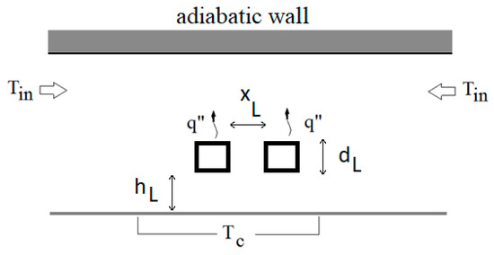 Open cavity with discrete heat sources considered here is shown in Figure 1. The system studied in the current paper (Cartesian coordinates) consists of a side opened cavity that has thermal interaction with constant temperature sources: the environment (inlet at Tin = T∞ and adiabatic outlet flow) and the bottom plate (solid wall at Tc = T∞). In accordance with thermal insulator tests and to obtain the highest possible temperature on the top plate, adiabatic conditions are assumed. Discrete heat sources with known characteristic length (DL) and constant gap distance (XL) are suspended at a specific height (hL) from the bottom plate. The working fluid is compressible and Newtonian. The gravity acts in a downward direction. The summary of equations and boundary conditions are shown in Table 1 and Table 2, respectively. Although the three-dimensional (3D) numerical analysis is relatively more accurate when compared to a two-dimensional (2D) one, its computational cost is significantly higher. Hence, due to avoiding a high computational cost and also the simplicity of the problem (less parameters for study), the 2D domain is assumed to simulate the system. Although a 2D analysis neglects the ending effect of heaters and the extension of natural convection cells in the third dimension, this approach is widely used for analyzing a natural convection problem when the length of heaters is comparable to the third direction.