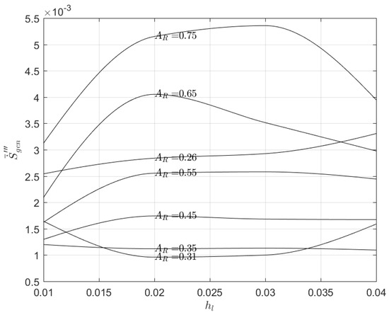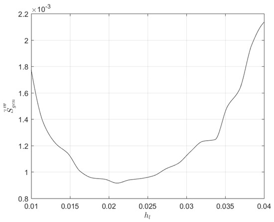 The optimization results using three lamps with Nr = 1 and AR = 0.3 are shown in Figure 2. As shown, the generated entropy decreases in direct relation to the increase of the lamp distance from the bottom plate. For the values of hL that are higher than 0.021, an increase in the lamp distance from the bottom plate causes to increase the irreversibility Therefore, the optimal distance of discrete heat sources is 0.021. The dimensionless quantities of Nr = 10 and AR = 1/2 are arbitrarily selected to study the effect of the parameters on the system’s behavior. The value of the Prandtl number is used here and is adapted with the value of air (Pr = 0.71). An increase in the lamp distance from the bottom plate causes a decrease in the entropy generation due to the heat transfer as a result of a decrease in temperature gradients. When the distance of the heat sources from the bottom plate increases, the action region of heat sources at the cooling plate increases, which leads to a decrease in the temperature gradients. At the same time, an increase in the lamp distance from the bottom plate causes an increase in the entropy generation due to the friction as a result of an increase in the natural convection force. The increase of distance of the heat sources from the bottom plate also lets a higher space of the natural convection. Consequently, since the length of the path that fluid gains energy increases, the velocity increases. It then causes higher amount of vorticity generated entropy.