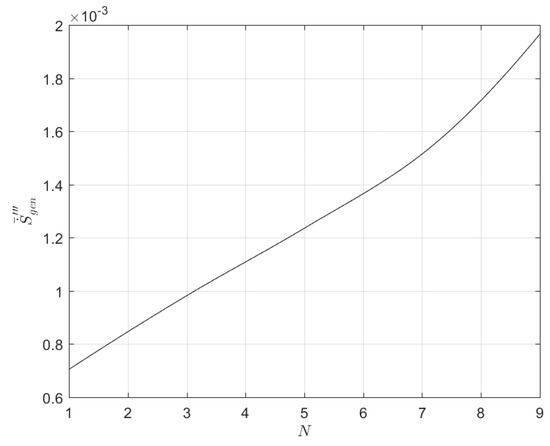 The generated entropy as a function of the lamp number for Nr = 6 and AR = 0.3 is plotted in Figure 6. It can be observed that an increase in the heat source number causes an increase in the irreversibility constantly. Therefore, the optimal number for the heaters is one heater. An increase in the heat source numbers causes an increase for both components of the entropy productions, including the friction and the heat transfer, which produce irreversibility through the system. Hence, it is found that using less heat sources is efficient based on the second law analysis.
