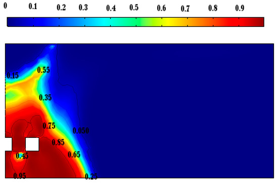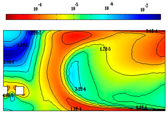 Figure 7 shows the distribution of the dimensionless total rate of entropy generation (by kf/L2) for three discrete heat sources with Nr = 1 and AR = 1/2. For this configuration and input heat flux, most of the irreversibility is produced at the open side of the cavity. The zone near the lamps where the highest temperature gradient occurred does not contain the highest entropy generation, while the open side that contains the highest magnitude of vortex generation has the highest values of irreversibility and most energy quality is lost at that zone. The maximum entropy generation rate occurred at the inlet of air near the heated top wall.
