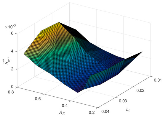 Other than the one parameter optimization done in Figure 3, Figure 4, Figure 5 and Figure 6, in many applications it is necessary to optimize the system parameters together. Figure 9 reveals the variation of dimensionless total entropy generation rate per unit volume (kf/L2) throughout the open cavity for N = 13 and Nr = 1 as a function of the aspect ratio and the height of discrete heat sources from the bottom. The 2D profile of that 3D surface is plotted in Figure 10 to make its values clear. As shown, based on the value of the aspect ratio, there are different optimums in the range that is used for the height of discrete heat sources from the bottom. The saddle shape surface shown in Figure 10 has a dent near the surface of AR = 0.3. The point hL = 0.02 is the optimum point for AR = 0.31, but it is the worst choice when AR = 0.65. Hence, the recommended values should be used in the specified condition and could not be used in all of the ranges.