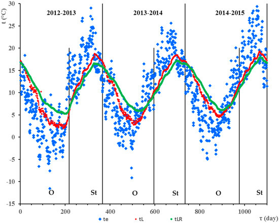 Ground mass temperatures in the area of linear HGHE (tL), reference ground mass (tLR) and ambient air temperatures (te). O—operation of HGHE; St—stagnation of HGHE.