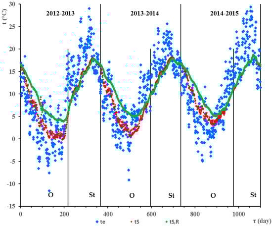 The average daily temperatures of the ground mass in the proximities of HGHEs (obtained over a duration of 1100 days), the reference ground mass temperatures and ambient temperatures in the heating periods or periods of operation, O, and periods of stagnation of the HGHEs, St, are presented in Figure 1 and Figure 2. The graphs show the dependence of the two ground mass temperatures on ambient temperatures. With adequate accuracy, the trend of ground mass temperatures during heating periods and periods of stagnation of the HGHEs can be expressed by an equation of free undamped oscillations of the mass point [23,24].