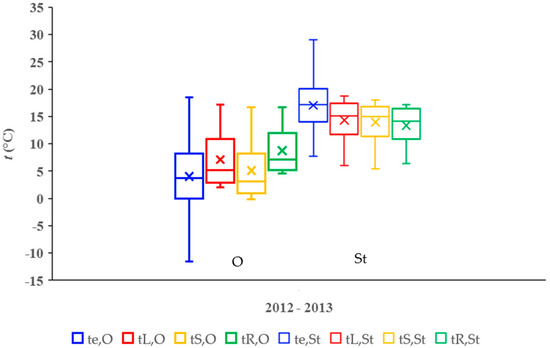 Box plot of temperatures of ground mass with linear HGHE (tL,O, tL,St), slinky HGHE (tS,O, tS,St), reference ground mass (tR,O, tR,St), and ambient temperatures (te,O, te,St) during the heating season 2012/2013 (O) and the period of stagnation of the HGHEs in 2013 (St).