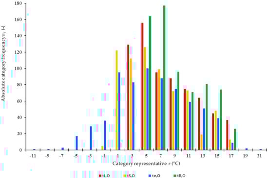 Frequencies of average daily temperatures of the ground masses (tL,O, tS,O), reference ground masses (tR,O), and ambient temperatures (te,O) during the heating periods occurring between 2012 and 2015.