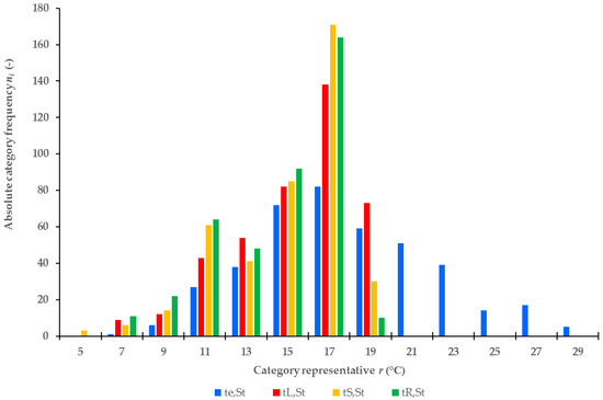 Frequencies of average daily temperatures of the ground mass (tL,St, tS,St), reference ground mass (tR,St), and ambient temperatures (te,St) during periods of stagnation of the HGHE occurring between 2012 and 2015.
