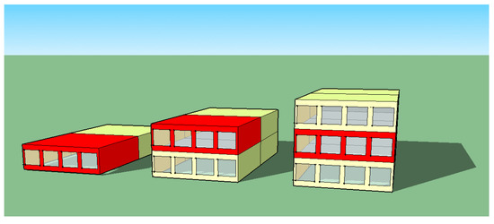 A sample of six existing building typologies has been defined for the refurbishment, starting from a base module oriented towards the main cardinal directions, with a square floor area of 100 m2, chosen in agreement with the weighted average surface of the European residential buildings [49], an internal height of 3 m and a window to floor ratio equal to 0.144 (Figure 1). The compactness ratio S/V of the module has been varied by imposing adiabatic boundary conditions, aimed at characterizing adjacency to other apartments assumed at the same setpoint conditions. All modules have an adiabatic vertical wall while ceiling and floor can be either adiabatic or exposed to the external environment, depending on the specific case modeled. Intermediate flats in multi-story buildings (S/V = 0.3 m−1) are characterized by both ceiling and floor as adiabatic, penthouses (S/V = 0.63 m−1) only by the floor, and semi-detached houses (S/V = 0.97 m−1) have no adiabatic horizontal components. Taking advantage of the findings reported in [39,50], in this study, the windows have been positioned only on the façade in front of the adiabatic wall and oriented towards east (east-oriented buildings) or south (south-oriented buildings).