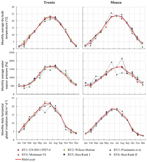 A preliminary comparison has been performed between the six reference years developed for Trento and for Monza, as shown in Figure 2 for monthly averages of dry bulb temperature, water vapor partial pressure and daily global horizontal solar irradiation calculated for the RYs and the multi-year series.