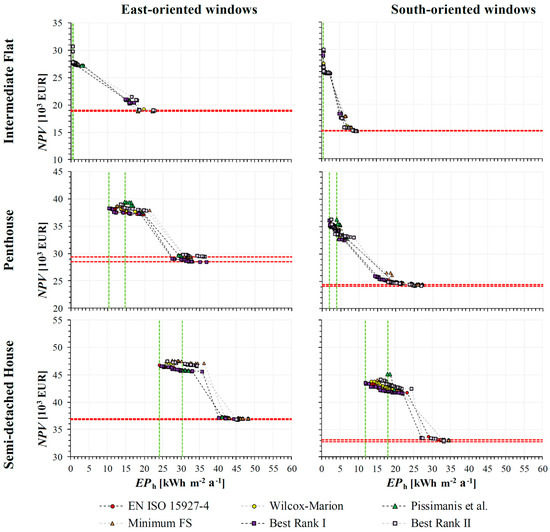 The fronts’ relative positions in the charts are shifted according to the deviations in the initial solutions. In Trento, minimum EPh and NPV are achieved with RY2 and the maximum are registered either with RY3 (south-oriented buildings) or RY1 (east-oriented buildings), coherently with what observed in Section 3.2. In Monza, the differences are less marked and, for solutions with natural ventilation, they are even negligible. The minimum EPh and NPV are found with RY5, coherently with the analysis of the existing buildings’ performance, and the maximum ones for RY3 and RY6.