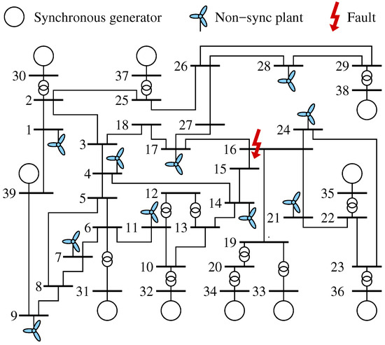 Figure 2 shows all non-synchronous generators and the location of the fault, which is a direct 3-phase short circuit at bus 16 cleared after 300 ms by the disconnection of line 15–16. A GAMS model corresponding to this case is provided as a separate file in [