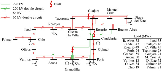 Figure 5 represents a model of the Tenerife power system including several wind and PV power stations that account for renewable generation expected to be installed in the near future. The transmission network includes a 220 kV grid that covers the most populated areas and a 66 kV ring around the island. Most lines are double circuits, so the loss of one circuit does not necessarily disconnects the substations at both ends of the line.