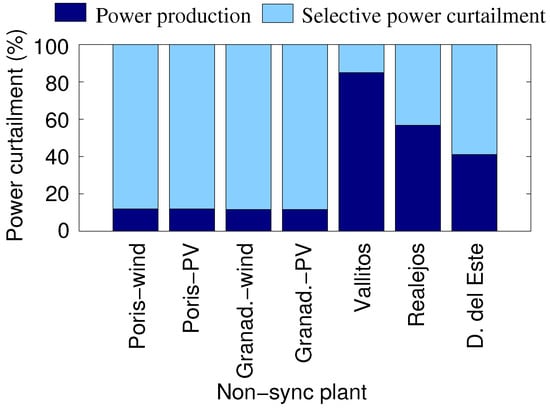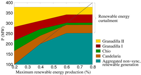Figure 8 shows the optimal distribution of the curtailment between non-synchronous power plants when the load is lowest and the availability of renewable resources is highest.
