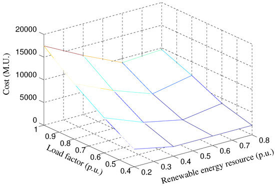 A similar study has been performed calculating the optimal solution for different load factors and availability of renewable energy. Studied load factors range from 0.4 to 1 p.u., where load factor 1 corresponds to peak load, and availability of renewable energy ranges from 0.2 to 0.8 p.u.