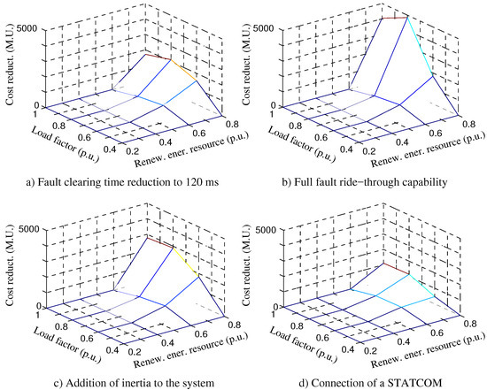 Figure 11b that the provision of full fault ride-through capability provides the largest reduction in cost. This can be explained because the sudden disconnection of non-synchronous generation displaces the equilibrium point of the system and can therefore worsen the electromechanical oscillations of synchronous generations, and because the loss of non-synchronous generation decreases the frequency of the system.