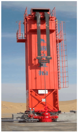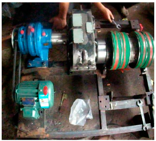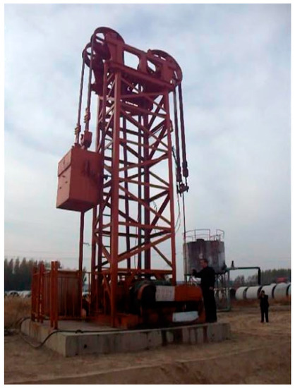 The new pump in this paper compared with beam pumping oil machine has the following main system differences: a new type of transmission mechanism, converting rotational motion into reciprocating, is designed to replace the four link mechanism of a beam pumping unit. Then according to the change of the adaptability of the core institutions, adjustable stroke mechanism and balancing device are designed and the new pump system diagram is shown in Figure 20. This pump is changed to drum type pump with vertical frame from the conventional by the design of reversing transmission device, mainly composed of a motor, adjusting the stroke mechanism, speed reducer, reversing device, roller, and counterweight parts. Figure 21 is a non-circular gear reversing box device photo, and Figure 22 is a field test photo of a coal seam gas extraction machine based on incomplete non-circular gears.