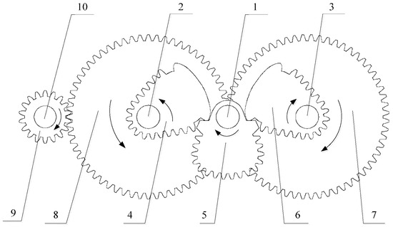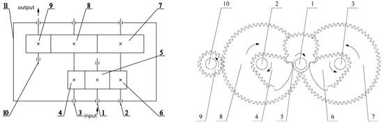 Sketch of a non-circular gear reversing box. 1—input shaft, 2, 3—transmission shaft, 4, 6—driven non-circular gear, 5—driving non-circular gear, 7, 8, 9—spur gear, 10—output shaft, 11—gear box.