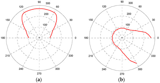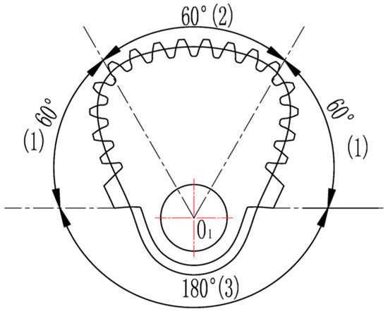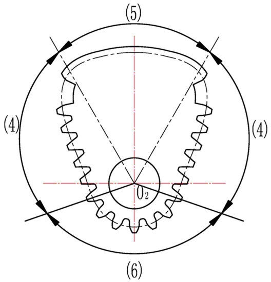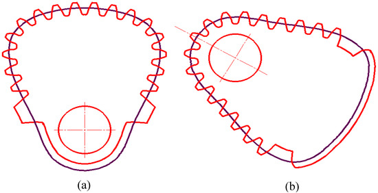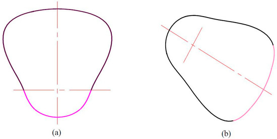 Combined with the actual conditions of the non-circular gear reversing box, we should try to get the angle φ2 of the driven non-circular gear 4, 6 toothed part large in order to increase the non-circular gear’s meshing area and reduce the error, generally taking φ2 as 300–330 degrees (300 degrees in this article). The design parameters of the non-circular gear are as follows: center distance of non-circular gear pair a = 360 mm, maximum transmission ratio i12max = 2.811, minimum transmission ratio i12min = 1/3, angle of driven non-circular gear 4, 6 = 300 degrees, so the pitch curve of driving non-circular gear 5 (Figure 12a) and non-circular curve section gears 4, 6 (Figure 12b) are calculated by a MATLAB program [27,28].