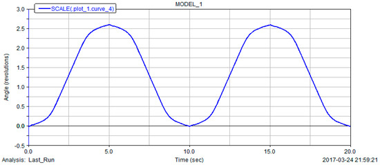 Consequently, the simulation curve of the output shaft speed of the non-circular gear reversing box is enlarged by 0.3π times by the scaling command, and the effective output line speed of the roller, namely the polished rod speed, is obtained. Then the integral of the scaled curve is processed, and the curve of drainage machine polished rod displacement over time will be obtained, as shown in Figure 19.