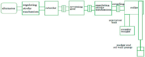 Chinese coal bed methane resources are relatively rich and concentrated which makes their exploitation a relatively new clean coal industry in the world [1]. The exploitation technology of coal bed methane is largely based on the oil field experience, so the traditional beam pumping unit is still used in most of the equipment, as shown in Figure 1. Feng [2] analyzed the main defects of the beam pumping unit according to its working conditions. The main one is that beam pumping units use crank rocker mechanisms, which leads to their poor adaptability. When encountering some special coal seam gas, the overall size of the pumping unit needs to be adjusted to change the stroke, which seriously affects the efficiency of CBM exploitation. The low efficiency of the beam pumping unit is another reason and the energy waste of the pumping unit is very serious. Li and Fan [3], and Fu [4] have made some adjustments and improvements on the basis of the conventional beam drainage machine appeared the specific. However, Liu [5] and Fan [6] argue that this cannot solve the fundamental drawbacks of the crank rocker mechanism improving performance in a relatively small range and the poor adaptability and low working efficiency shortcomings of beam pumping will still exist. Based on this series of drawbacks, all kinds of new non-walking beam drainage machine have emerged. At present, Li [7], Liu [8] and Qi [9] have all done a lot of research on these machines which can be roughly divided into two types according to the switching mode, namely mechanical reversing and motor reversing. Niu [10] and Shao [11] have studied the typical chain drainage machine as an example of a non-beam mechanical reversing device, as shown in Figure 2. The utility model has the advantages of good balance performance, convenient adjustment balance, small side force when reversing and working and light weight. The disadvantage is that it has more moving parts, an unsealed gas balance system and it can lose load protection leading to a higher failure rate.