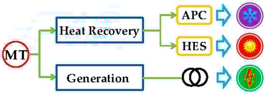 Generally, the efficiency of MTs’ working in electricity generation is 30% with full load, or 10~15% with half load. It is very inefficient, letting much heat energy go to waste. Actually, the efficiency could increase to more than 80% if the remaining heat energy is reused by CCHP operation mode []. CCHP is composed of a generation module and a heat recovery module, and the latter is further split into an absorption chiller (APC) and a heat-exchanging system (HES). The generation, APC and HES modules export electricity, cold and heat energy, respectively. The structure is shown in Figure 1.
