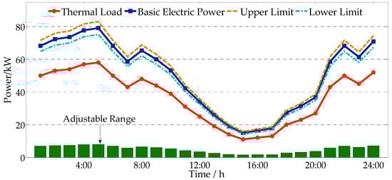 In general, MT is designed to operate in CCHP mode. The electric power generated by MT is only decided by the whole MG’s thermal or cooling load. On this occasion, the electric power output of MT is converted from a decision variable to a constant value which is related to the thermal or cooling load only. Consequently, the optimization model for MG is simplified and the effect devoted by MT to operation performance is weakened. Based on the fact that little variation (5% in this paper) in environmental parameters will not have great impacts on people’s comfort fell, an improved dispatch strategy for CCHP was presented, as shown in Figure 2 (taking the case of thermal load for example). The basic electric power is determined by MG’s thermal load, while the upper limit rises 5% and the lower limit declines 5% due to the variation margin of indoor environmental parameters. Intuitively, the columns in Figure 2 stand for the adjustable range of an MT’s electric power generation.