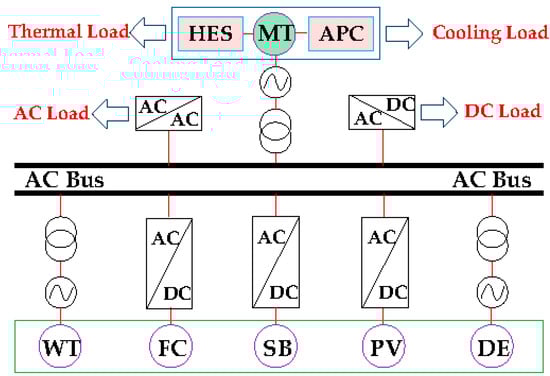 Owing to the great pressure of the global energy crisis and environmental pollution [], much effort has been devoted to integrating different kinds of distributed generations (DGs) into microgrids (MGs) in order to reduce carbon emissions and improve power quality []. MGs could operate in grid-connected or islanded mode, managing all kinds of DGs effectively []. This is an ideal way to realize local coordination control and optimized operation of multi-DGs, including micro-gas turbines (MTs), diesel engines (DEs), fuel cells (FCs), photovoltaics (PVs), wind turbines (WTs), small hydropower and some energy storage devices such as flywheels, super capacitors and accumulators []. Most of the existing MGs are designed to work primarily under on-grid mode, excluding emergency situations []. However, the impact of hybrid renewable energy sources (HRES) to power system should be paid much attention. Researches such as the unsymmetrical faults [], improvement of transient stability [], ground fault current [] were conducted for MG and they are beneficial to the application of renewable energies. On the other hand, more and more attention is drawn to study the stand-alone MG for its capability to supply power economically in some other particular applications, such as MGs for islands or remote areas without power grids [,].