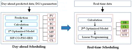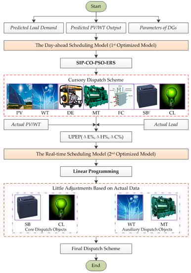 All the controllable DGs and CLs are dispatched in the day-ahead scheduling on the basis of 24-h forecasted output of WT and PV, while only ESS and CL are dispatched in the real-time because of their fast response speed, and MT or WT was assistant dispatch means at the same time. The overall optimized process is shown in Figure 4.