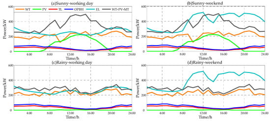 where CMT represents the fuel cost of the MT in the operation time; Cnl stands for the natural gas price; PMT is the electricity energy produced by the MT, and ηMT represents MT’s efficiency; Δt is the dispatch interval time, and it is 1 h in this paper; QMT is the residual heat of exhaust air after power generation; ηl represents the heat loss factor of the CCHP system; QH and QC represent the heating and cooling capacity generated from the residual heat of exhaust; ηH.REC and ηC.REC are the heat and cooling efficiency, respectively. ξH and ξC stand for the heating and refrigeration coefficient respectively. For detailed information about PV, WT, FC, DE and ESS, please refer to [,,].