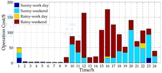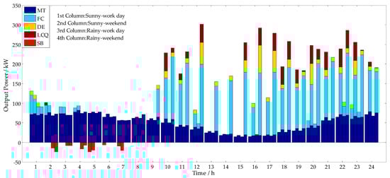 For a multi-objective optimization problem, the best condition is to find the absolute optimal solution. However, subgoals are usually contradictory with each other and it’s impossible to find a common solution that makes all the sub-goals achieve optimal values at the same time. Therefore, the multi-objective model is transformed into a weighted single-objective model to optimize the whole system’s operation cost. Considering that the model of the first time scale has been converted into single-objective optimization model, this paper proposes SIP-CO-PSO-ERS to solve the day-ahead scheduling model. Fewer decision variables and constraints simplify the model in the second time scale. Linear programming in MATLAB/Optimization Tool (R2011B, MathWorks, Natick, MA, USA) was conducted to solve the real-time scheduling model.