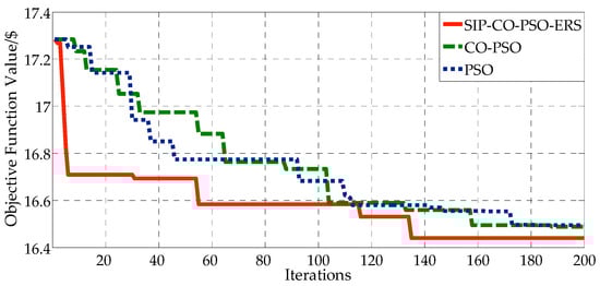 Due to the full use of individuals’ and group’s experience, the PSO algorithm is able to approach the optimal solution with a relatively high convergence efficiency []. Because of the consideration of CL and multi-scenarios, more decision variables, constraints, and intricate data for variable scenarios complicate the optimization model. Therefore, the PSO exhibits the problems of premature, poor local and global search ability when solving the optimized operation model of stand-alone MG []. Specially, a fall into the local optimum because of the oscillation around certain local optimums with inappropriate step lengths would occur. In addition, the convergence speed is slow in later iterations because the optimum search goes beyond the constraints easily when there is great fluctuation in predicted data from different scenarios, causing the process to repeat several times until the constraints are all satisfied. However, the MG’s day-ahead optimized scheduling requires not only a faster solution speed to meet the dispatch timeliness, but also an excellent search performance to satisfy dispatch accuracy. Reasonable modification must be developed to improve the properties of basic PSO. In this paper, a dual-step modification consisting of SIP and CO is introduced into PSO as well as ERS.