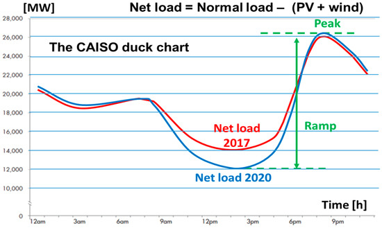 The studies show that, besides stability problems, a high penetration of PV-based systems during daytime may lead to abnormal operating conditions (e.g., high down-ramping and low load of operation, suboptimal operation point) for all load following units committed for the specific day. Thus, systems need to follow a net demand (load demand minus production from PVs) in the form of a duck shape with steep ramping needs. The example given in Figure 1 shows an increase by 220% for the interval between 20:00 and 21:00 (peak hours) compared with the interval 12:00–16:00, when solar production was the highest in the day. Therefore, there is a need for an excessive ramp of 13 GW in only 3–4 h. This situation is far from the normal operation of most traditional power plants. The study identifies storage as an economically viable and efficient solution to this problem, which is expected to occur in systems with high PV penetration. For this reason, the easiest and most commonly applied solution by a DSO (distribution system operator) or a TSO (transmission and system operator) is the curtailment of PV power generation, with figures raising up to 50% from the PV peak power [4,5]. Other approaches consider controlling local energy storage as a virtual, controllable load and a generator balancing facility [6]. Utilities and other stakeholders have to evaluate these solutions and their potential synergetic effects. Long-duration energy storage opportunities [3] show great potential for high rates of return on investment when based on a combination of actions such as renewable energy self-consumption, storing energy that otherwise would be lost due to grid constraints, back-up power in the event of grid failure, etc.