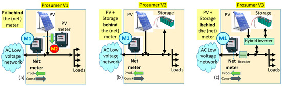 - Prosumer V1 (Figure 2a) has PV (or other intermittent, RES-based) generation behind the meter, connected to both the AC internal network and the DSO grid; depending on secondary legislation, available support scheme such as feed-in tariff (FiT) or green certificates (GC) might apply either for the excess energy measured by the net meter M1, or for the energy measured by the PV meter M2;