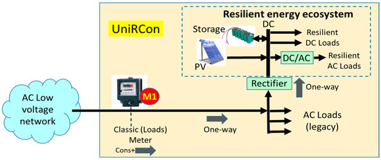 In UniRCon architecture we are focusing on the residential sector and its neighbourhood, and consider this uni-directional behaviour as a concept for developing resilient systems, both for energy supply and regulatory changes. The role of the common DC busbar for PV and storage connection, and extensions of the concept for neighbourhood resiliency, will be presented below. The UniRCon architecture offers enhanced cyber-security features, mainly due to the local relevance of the load-only behaviour of the considered system. The resilience is obtained in several ways: (a) resilience of the prosumer against regulatory changes, because investment assumes an independent ecosystem combining advantages of total self-consumption of locally produced energy while allowing acquisition of energy from the grid when local production is low or when the price of the energy from the grid is low; (b) resilience by design of the prosumer loads being supplied by an independent grid in cases of main grid failures; (c) on the grid side, the potential of increased resilience by reducing or even eliminating injections of stochastic generation in a scenario where all current and future prosumers adopt a design and operation similar to the UniRCon architecture. It is a win–win solution between the two parts—consumer/prosumer on the one side and the grid operator on the other side—having both the potential for implementing resilient behaviour, even if each of them may require opposing measures. This win–win situation is facilitated by the flexible, non-synchronous coupling between the main power system and the prosumer’s local system, compared with the rigid coupling specific to traditional systems.