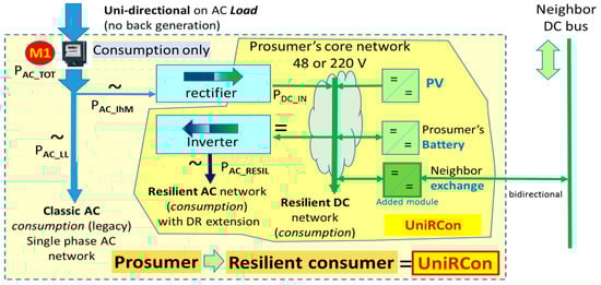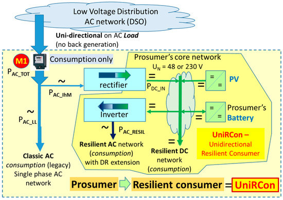 The proposed prosumer architecture is presented in more detail in Figure 4, while introducing also a possible resilient AC network supplied by the DC network. We introduce the following notations in Figure 4, for describing the energy transfer on the AC-side of the prosumer’s network: PAC_TOT: AC power transferred from the DSO network to the prosumer; PAC_LL: AC power to supply existing (classical) loads on prosumer’ premises (internal microgrid); and PAC_IHM: AC power supplied from DSO grid to the UniRCon network.