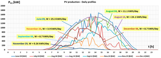 The scenario described above is derived from daily average consumption of a selected residential point having ECONS(day) = 15.8 kWh, with PPV = 2 kWp, and by treating the consumption and production versus storage in all use-cases for typical days from Figure 5, with daily electricity production of 12.6 kWh, 7.54 kWh, 4.36 kWh and 0.26 kWh, respectively (covering all seasons’ production expectancy); this corresponds to an operation of 1200 h/year at rated PV peak power.